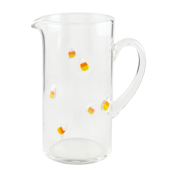 - The Candy Corn Pitcher is a stunning piece of handblown glassware that is sure to add a touch of whimsy to any table setting. This pitcher features intricate candy corn icons that are embedded within the glass, creating a unique and eye-catching design. This pitcher is perfect for serving your favorite beverages to family and friends. Whether you're hosting a Halloween party or simply want to add a festive touch to your everyday dining, the Candy Corn Pitcher is a must-have addition to your collection. Crafted with care and attention to detail, this pitcher is not only visually appealing but also durable and functional. Its sturdy construction ensures that it will withstand regular use, while its comfortable handle allows for easy pouring. Bring a touch of sweetness to your next gathering with the Candy Corn Pitcher.