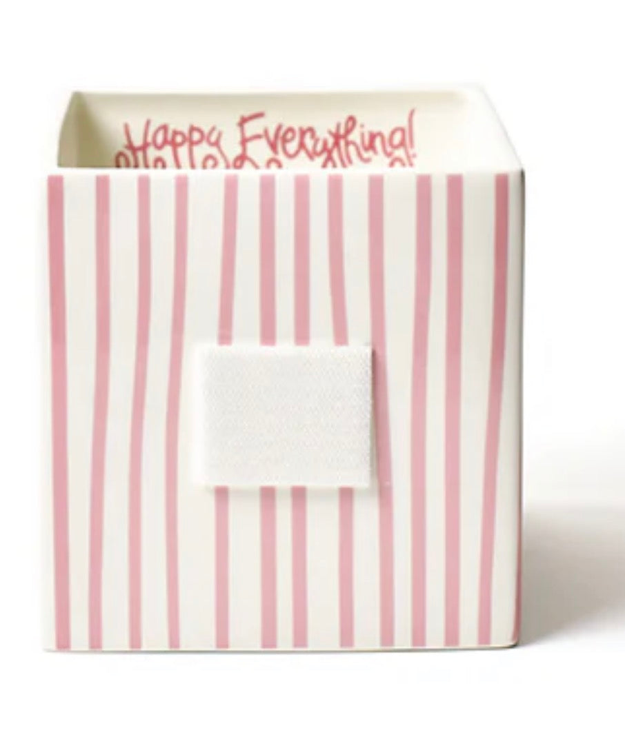 Organize your happy home with our Pink Skinny Stripe Medium Mini Nesting Cube. Designed in-house, the hand-painted pink and white stripes and interior “Happy Everything!” script make this Base a must-have. Whether it’s used as a planter or a catch-all dish, remember to add your favorite Mini Attachments to make it suit the season. Grab this giftable nesting cube today!