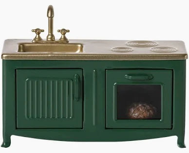The heart of every home is the kitchen. This metal kitchen has a beautiful color tone and has many playful details such as cabinet door, sink and an oven with a freshly baked pie. It is perfect in size for the mouse family.