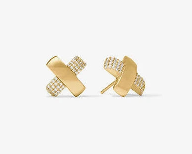 These studs bring a true X-factor, with one golden bar with a smooth satin finish overlapping another encrusted in glittering pavé for a cross between edgy and elegant.