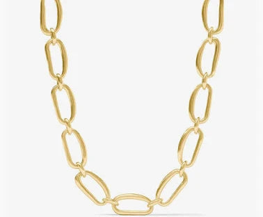 A necklace of undulating oblong links resembling hand-stretched golden rings, connected by curvaceous loops and featuring an adjustable toggle closure.
