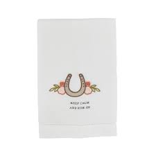 The Horse Shoe Embroidered Towel is a beautifully crafted piece that adds a touch of elegance to any space. Made from high-quality faux linen, this towel features intricate embroidery of a classic horse shoe design, symbolizing good luck and charm. The hem stitch detail enhances its sophisticated appearance, making it a perfect addition to your home decor. Measuring 21 inches by 14 inches, this towel is not only stylish but also practical, offering ample coverage and absorbency. Crafted from premium cotton, it ensures softness and durability, making it ideal for everyday use or special occasions. Whether displayed in a guest bathroom or used in the kitchen, this towel brings a refined and timeless appeal to your home.