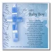 A truly one-of-a-kind gift for a baby boy. Our mosaic glass cross is handmade in the USA and is a blend of clear and blue glass shades. Each cross is uniquely made, just like the new baby boy is uniquely and wonderfully made! This 4 inch cross hangs from a white satin ribbon, perfect for year round display or as an annual treasure on a Christmas tree. Give this special gift on baby boy's Christening or Baptism Day, as a baby shower gift or other day you want to show your love. The cross comes with a beautiful sentiment and is boxed in a 5.5" x 5.5" white gift box with clear lid. A memorable Baptism or Christening, new baby or holiday gift for a new baby boy. Perfect inspirational baby gift from family or friends.