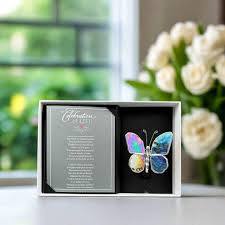Beautiful clear iridescent stained glass butterfly is paired with a Celebration of Life card making a memorable bereavement gift. The Limited Edition beautiful stained glass butterfly changes color based on the background and the light. The butterfly can sit as tabletop decoration or accent for desk, shelf or other special place. The size is 2.75"x2.5". The poem card features our "Celebration of Life" poem, you can add your message to the inside of the card, and it can be saved to display or frame. The card and cross are beautifully packaged in a white linen paper box with black inside flocking. The Celebration of Life memorial butterfly can be a gift of comfort for a Celebration of Life service or given to a loved one at any time of year. The butterfly can be displayed year-round and will be a treasured gift.