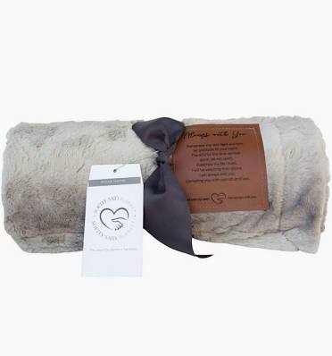 Our "Softly Said" Praying for You, comfort blanket measures 50"x65" and is overflowing with warmth and comfort. The faux fur and micro mink gray-toned blanket is an absolute gift for mind, body and soul. A loving message and scripture verse is embossed on a faux leather label and sewn on the blanket for the recipient to remember your message each time it is used. Gift packaged with large grosgrain ribbon and gift tag. Gift card includes insert card to share your personal message.