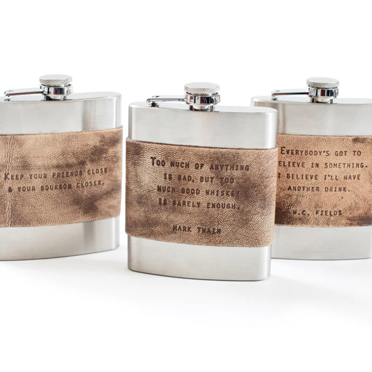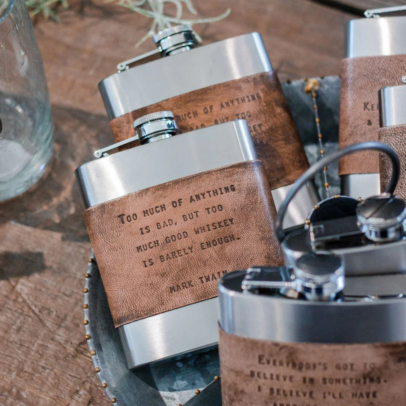 These leather flasks make for the perfect gift. Each flask is made of stainless steel with a leather wrap embossed with a quote. Due to the distressing of the design, verbiage may be difficult to read in some cases and is not considered flawed.