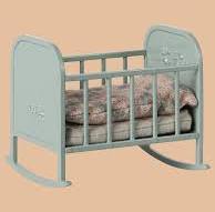 A beautifully designed cradle in metal with a soft sleeping bag and mattress inside. The cradle has a small flower embossment on the headboard and rounded legs so you can rock the little ones to sleep.