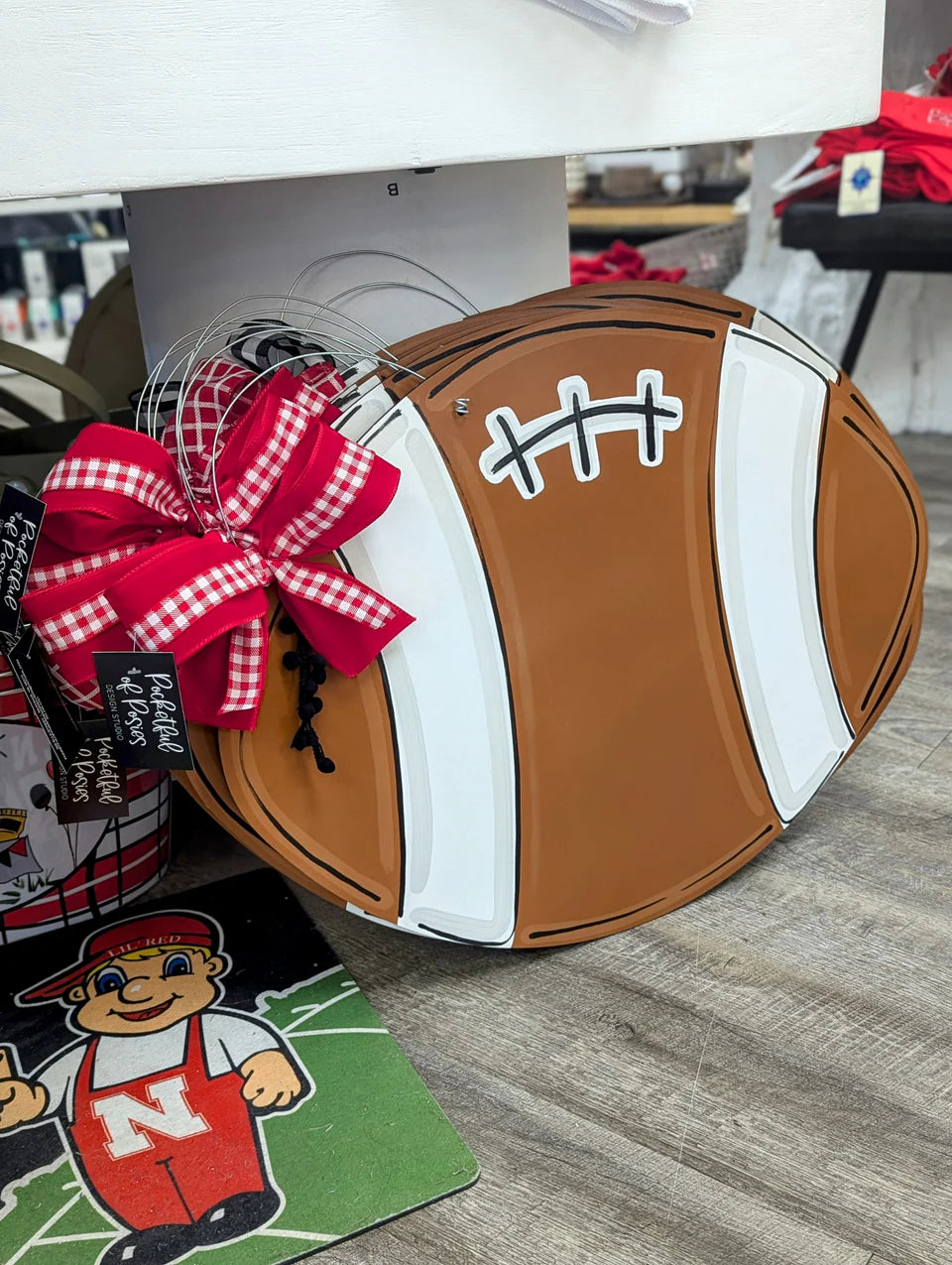 This sign is cut out of 1/4 inch Birch and painted with acrylic paint. It is sprayed with a clear protective coating that prevents chipping, peeling, fading, or yellowing. It hangs from sturdy wire and is accessorized with a bow to match. Every door hanger is hand painted by myself so there may be very slight variations between your actual design and what you see here.