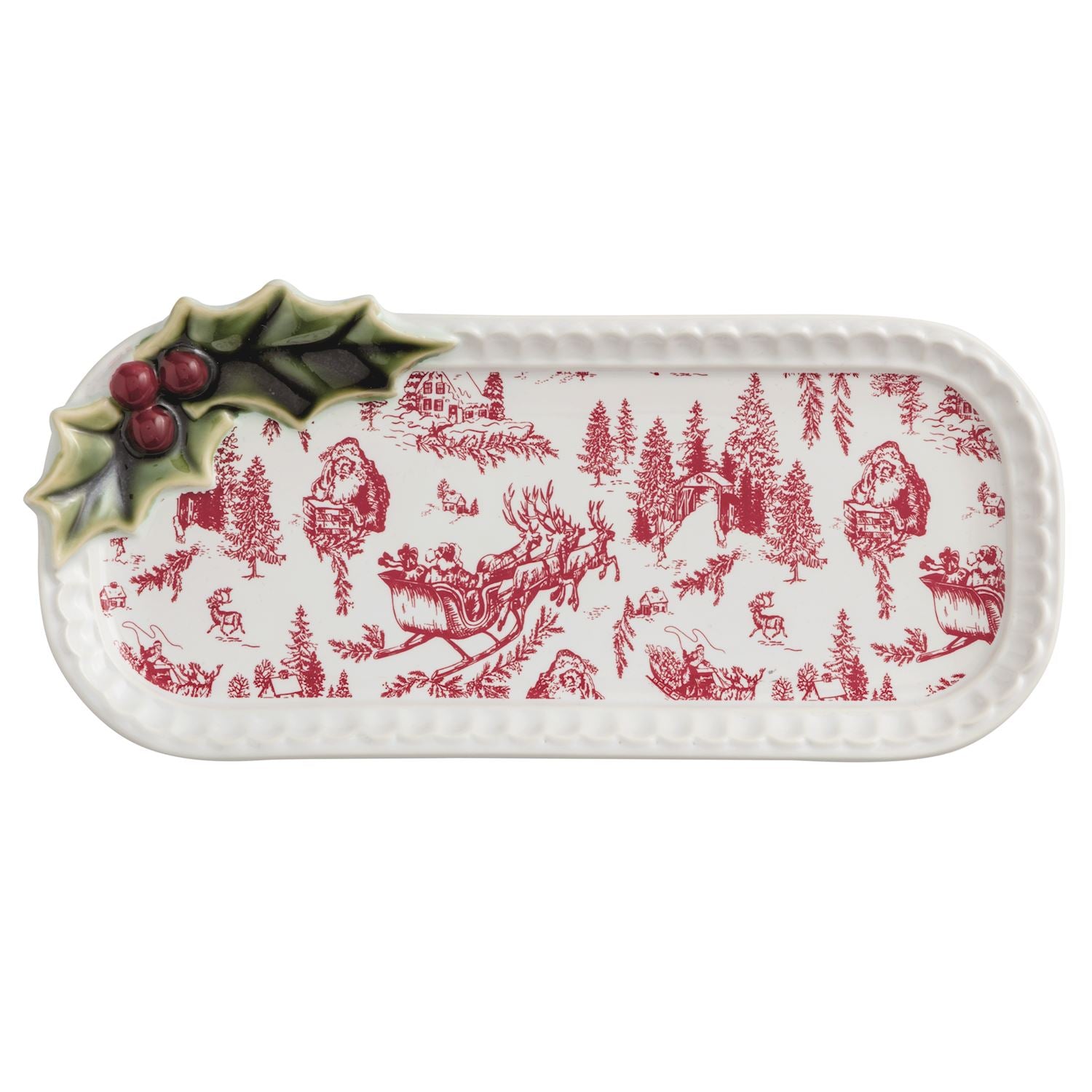 Fluted stoneware everything plate features toile surface and hand-painted stoneware holly cluster attachment.