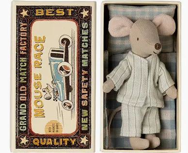 A classic Maileg item. This mouse is ready for hours of play and sleeps tight in the little matchbox. The clothes and bedlinen are made of soft fabrics with unique prints in beautiful colors. Extend the story by adding accessories to the play