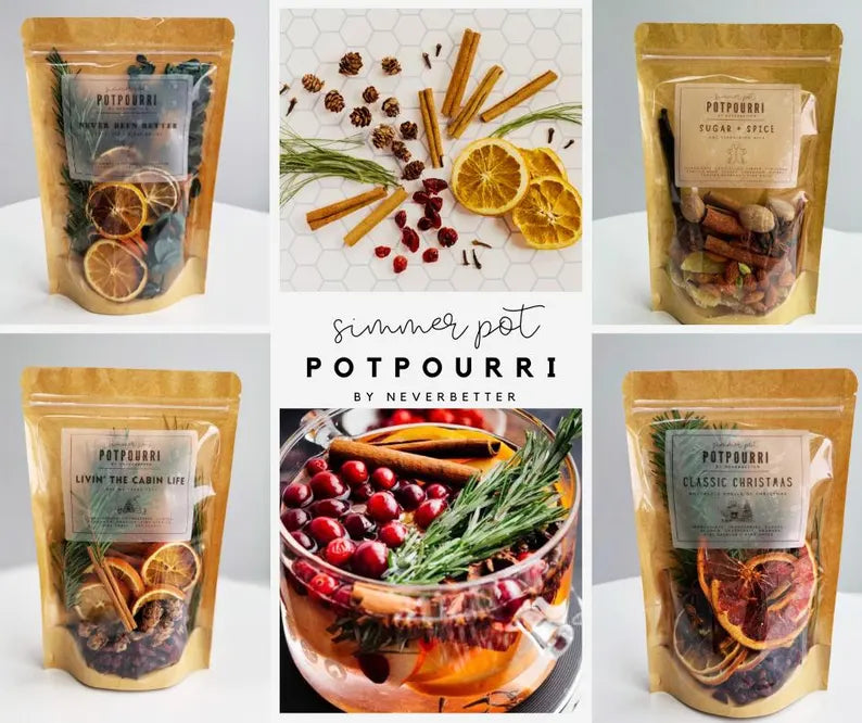 Made with all natural, high quality ingredients. Simply pour contents into a saucepan and add water to cover ingredients. Top off with water periodically. Our large simmer pot bags may be used up to three times. Your home will smell glorious!!